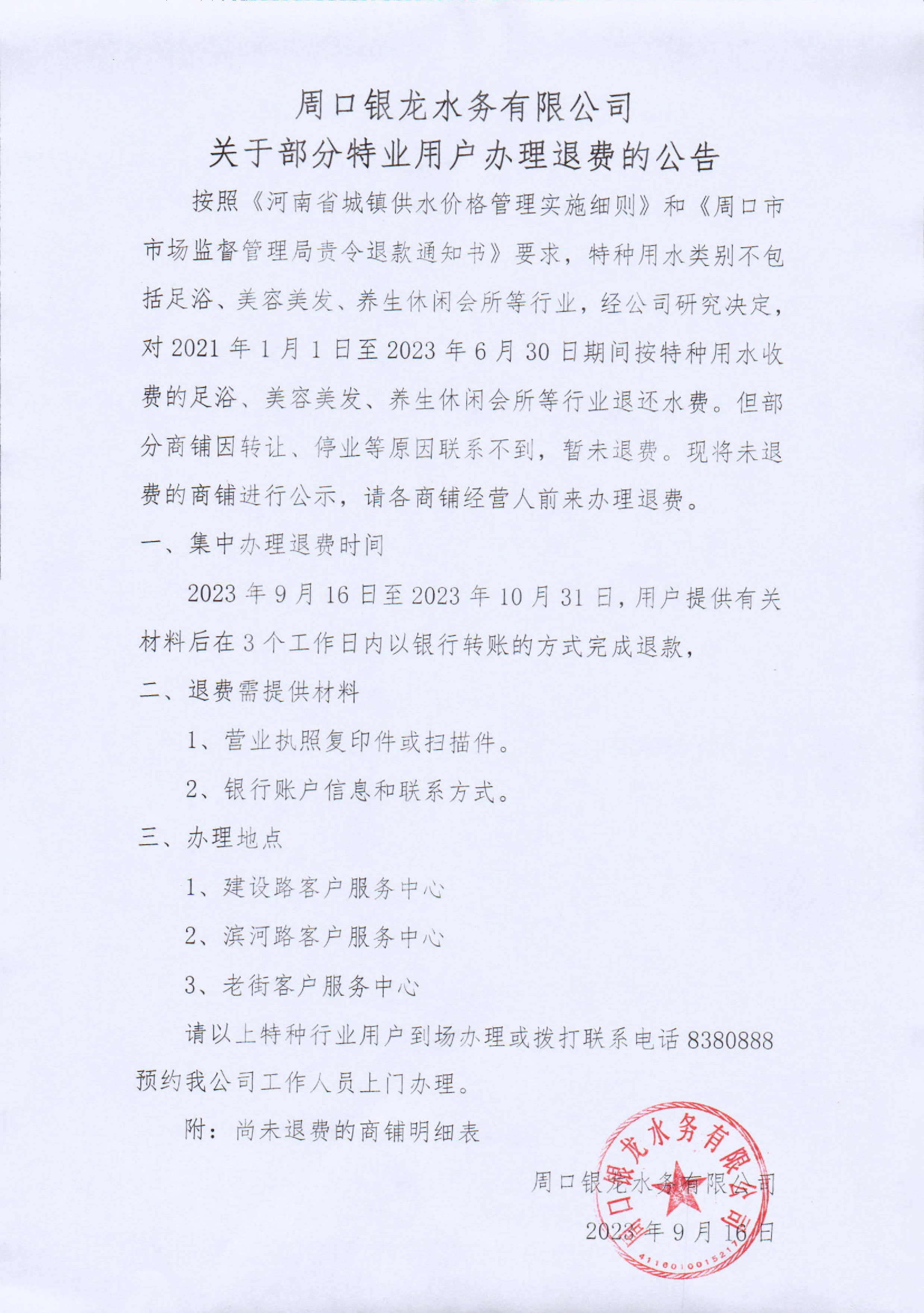 周口銀龍水務(wù)有限公司關(guān)于部分特業(yè)用戶辦理退費(fèi)的公告按照《河南省城鎮(zhèn)供水價(jià)格管理實(shí)施細(xì)則》和《周口市市場(chǎng)監(jiān)督管理局責(zé)令退款通知書(shū)》要求,特種用水類別不包括足浴、美容美發(fā)、養(yǎng)生休閑會(huì)所等行業(yè),經(jīng)公司研究決定...